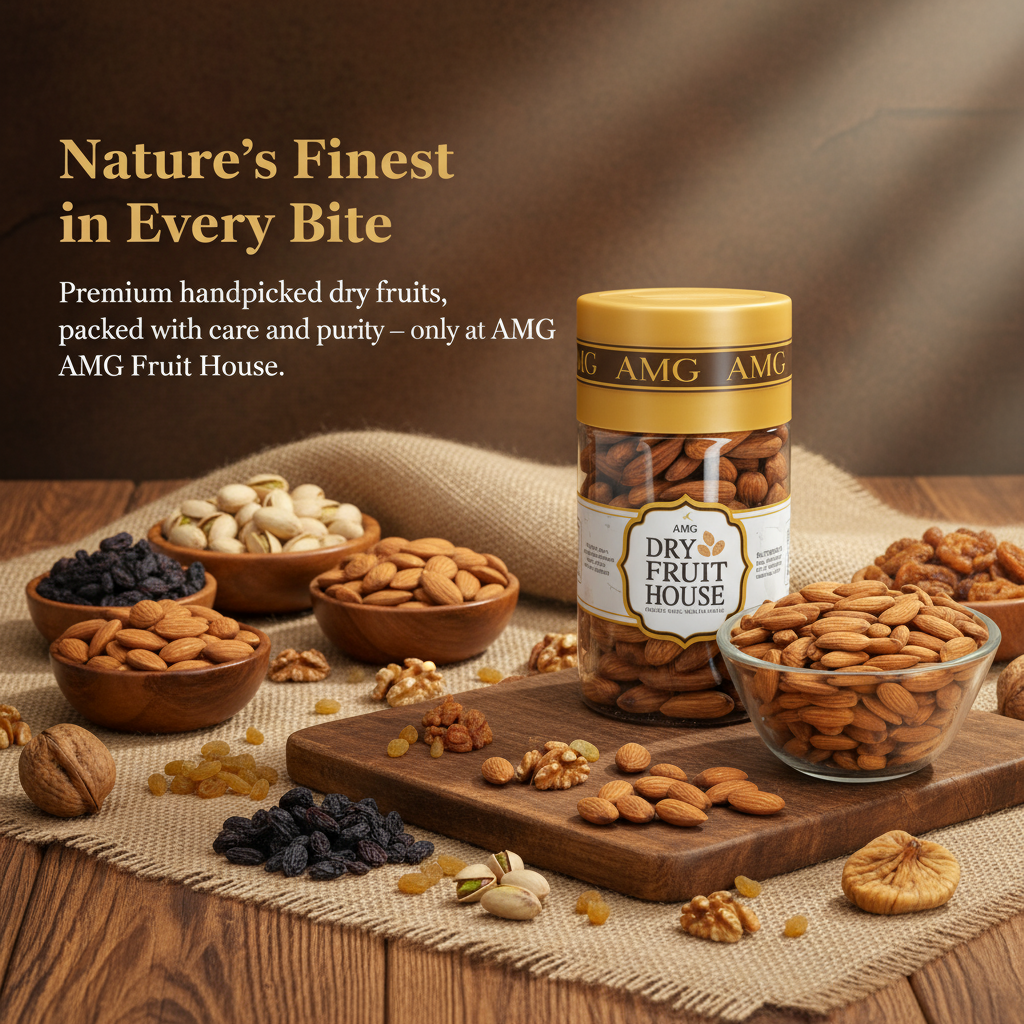 At AMG Dry Fruit House, our mission has always been simple to make healthy living easier, tastier, and more accessible through the power of premium dry fruits and wholesome snacks.